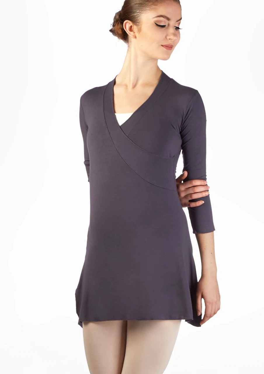 This mock-wrap dress from Ballet Rosa is a pretty and versatile addition to any dancer’s wardrobe. The clean, elegant wrap effect design gives you an easy warm up outfit without the need to adjust any ties. The short length and side slits make it easy to move around in and the silky smooth bamboo stretch fabric is supremely comfortable.
