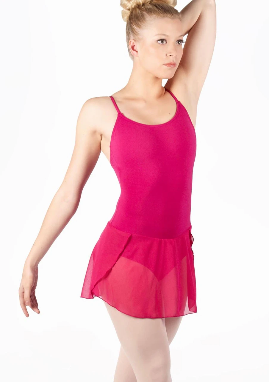A new leotard dress from Capezio, with a simple camisole leotard and overlapping, layered chiffon skirt attached. The camisole straps are adjustable and the shelf bra lining features logo elastic.
