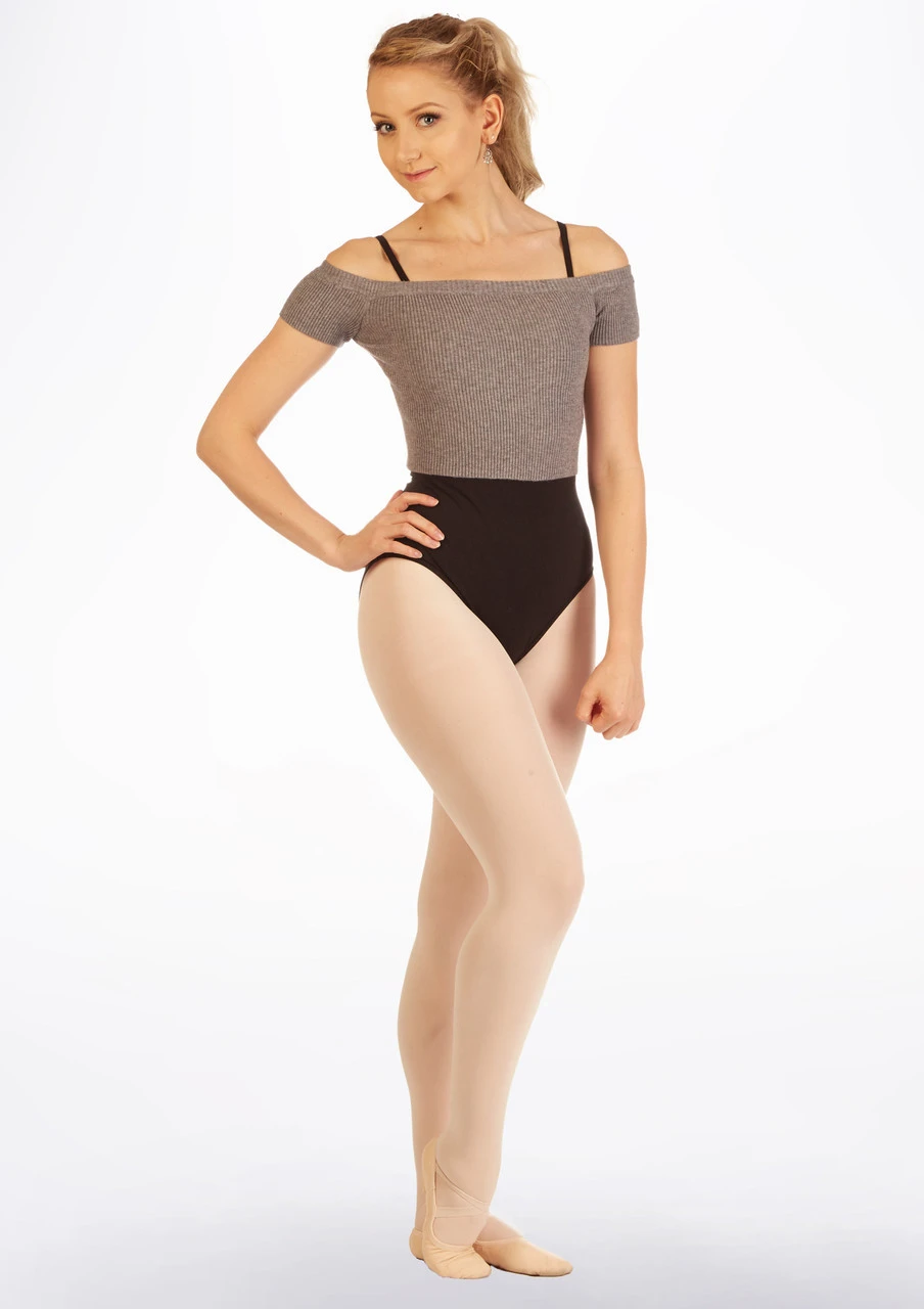 Inject a little style into your warmups wear with this cropped dance sweater by Capezio. The bardot neckline and capped sleeves are a dainty look to slim down your usual bulky warmups outfit!