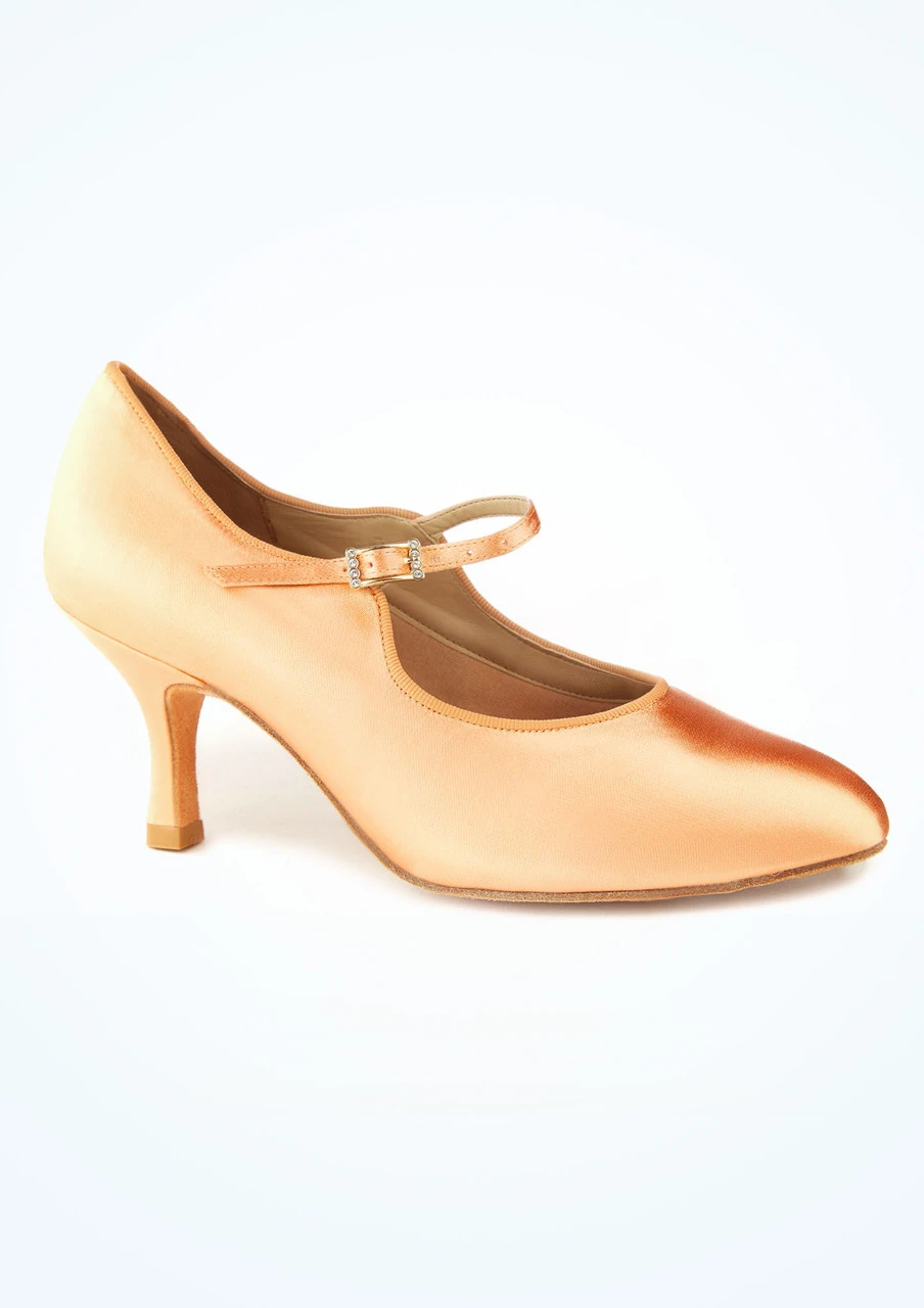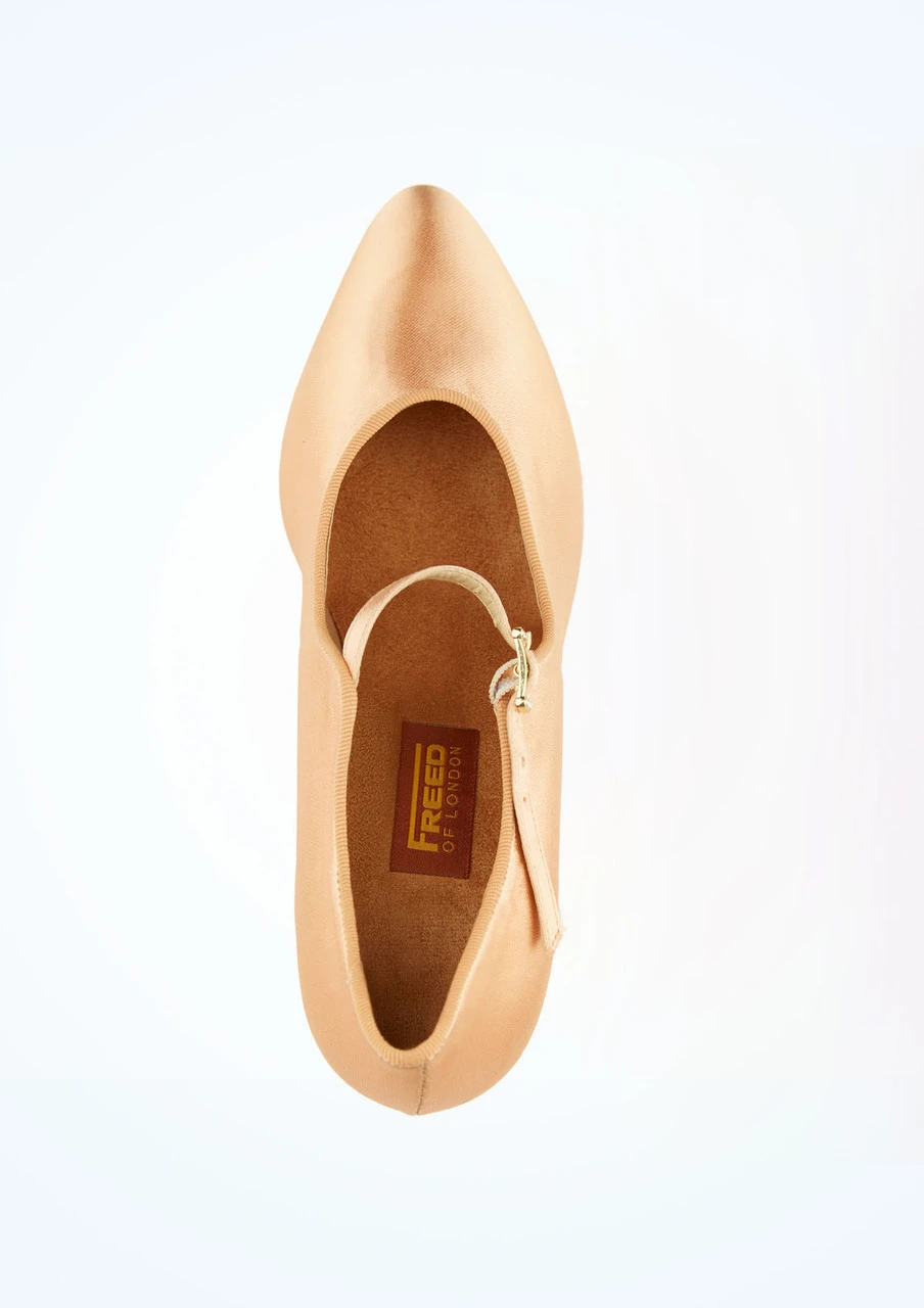 This mary-jane style court ballroom shoe from Freed is both practical and glamorous. The slightly pointed toe and slim flared give this shoe a distinctive shape that exudes elegance. Its satin upper is complemented by a sparkly diamante buckle. The straight across adjustable strap means this shoe will remain secure on the dancer’s foot.