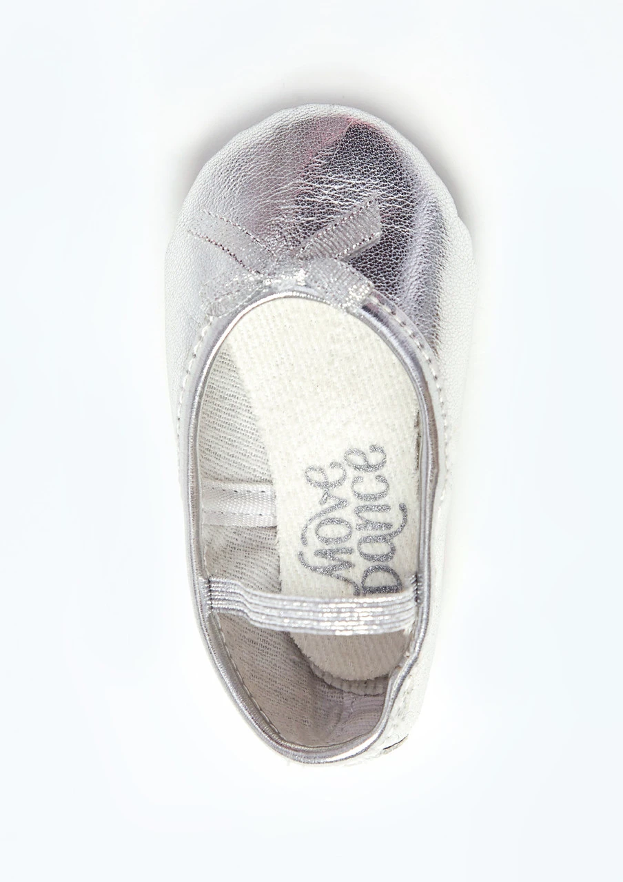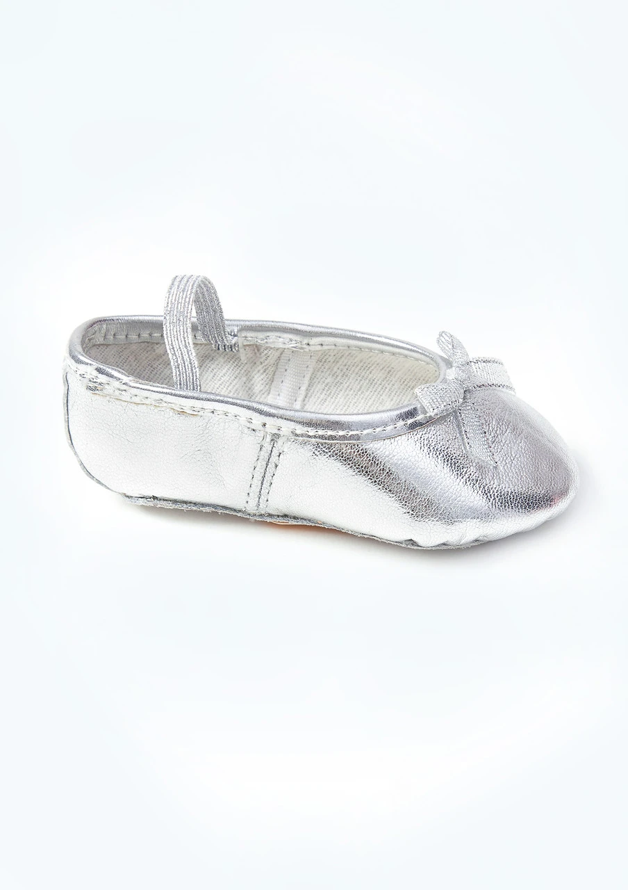 Add a touch of magic to ballet shoes! These beautiful ballet shoes are made from super soft leather to keep feet comfy all day. Featuring a silver glitter attached bow and suede soles. Easy to put on and off due to the silver attached elastic strap across the foot. Completed with a twill insole and lining for extra comfort. The perfect gift for an aspiring ballerina.