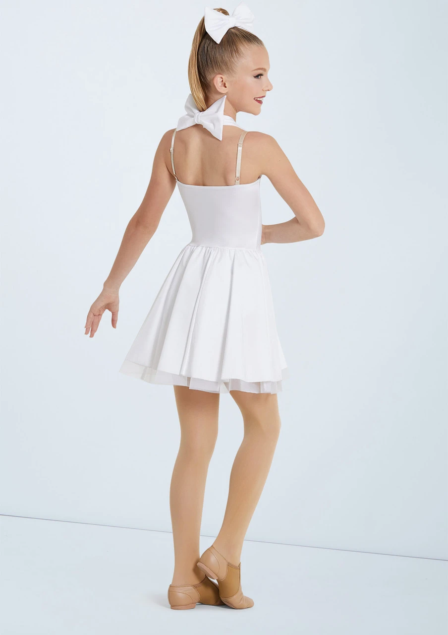 This fun, stylish halterneck dress with a sweetheart neckline is a perfect sweet costume for your dancers. The attached briefs and adjustable nude straps allow for comfort and flexibility. The snap closure at the back of the halterneck is discreet thanks to the large bow on the neck.
