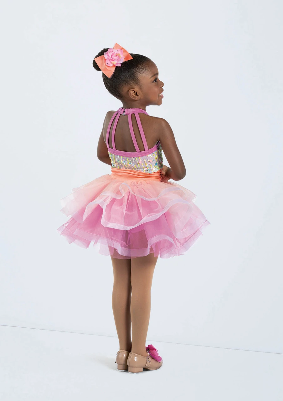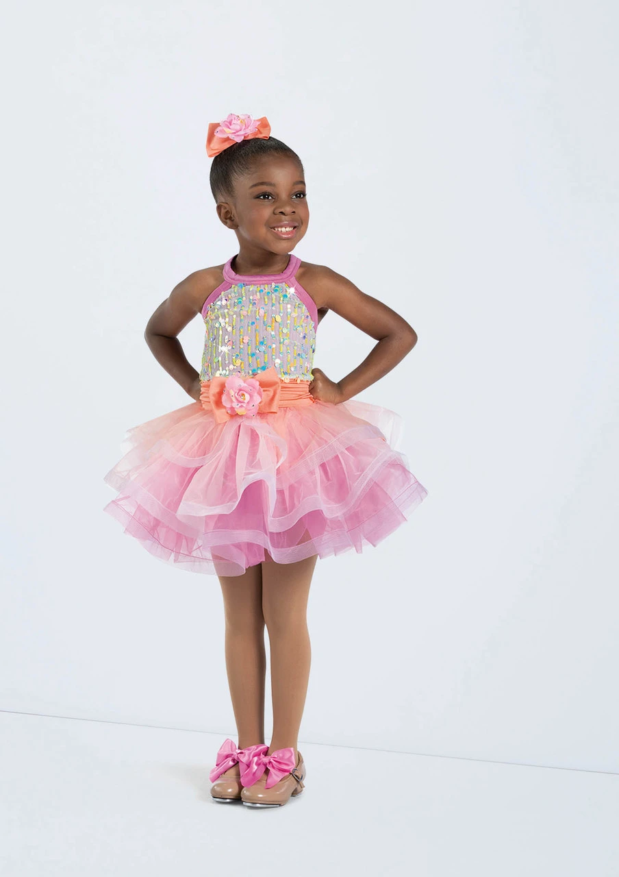 -Tiered skirt is tonal tricot with crinoline trim